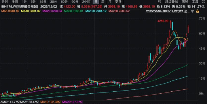 两岸融合连续三个交易日大涨了,指数更是朝着新高在突破。