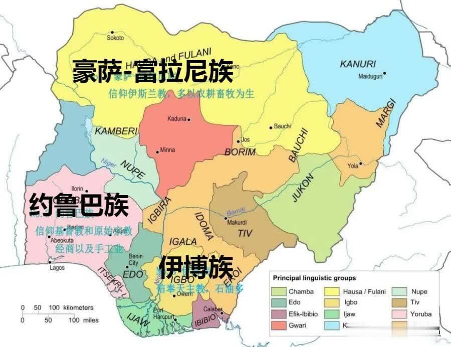 三大民族大致沿着尼日尔河与贝努埃河将全国分割的三块地区而分布。